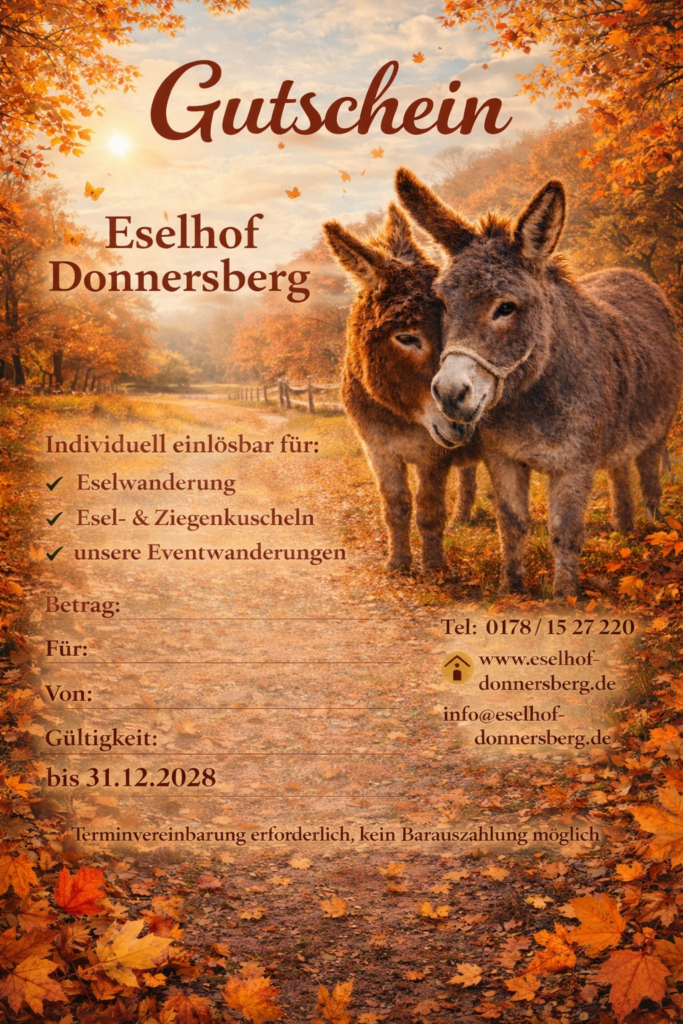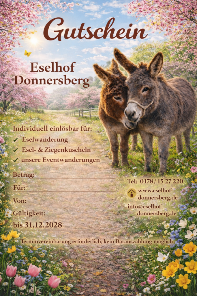 Anfrage und Bestellung auch per WhatsApp möglich. Tel.: 01781527220 oder über folgende Email: info@eselhof-donnersberg.de